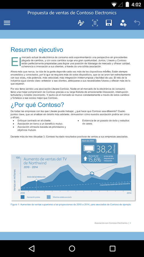 Microsoft Word para Android está diseñado para trabajar sobre la marcha. Word tiene el aspecto, funcionamiento y calidad que ya conoce de Office, con una experiencia táctil intuitiva diseñada para teléfonos y tabletas Android. Tanto si desea crear un bonito documento como si necesita únicamente leerlo y modificarlo rápidamente sobre la marcha, Word proporciona esa gran experiencia de productividad que desea. Trabaje con la confianza de saber que sus documentos tienen mejor aspecto con Office y que no perderá el formato o los datos cuando cambie de dispositivo. Podrá acceder cómodamente a sus documentos en la nube cuando los necesite.